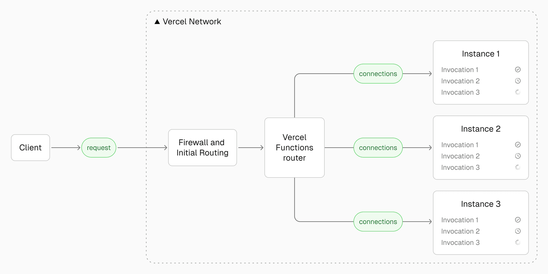 To address these inefficiencies, Fluid compute dynamically adjusts to traffic demands, reusing existing resources before provisioning new ones. At the center of Fluid is Vercel Functions router, which orchestrates function execution to minimize cold starts, maximize concurrency, and optimize resource usage. It dynamically routes invocations to pre-warmed or active instances, ensuring low-latency execution.
