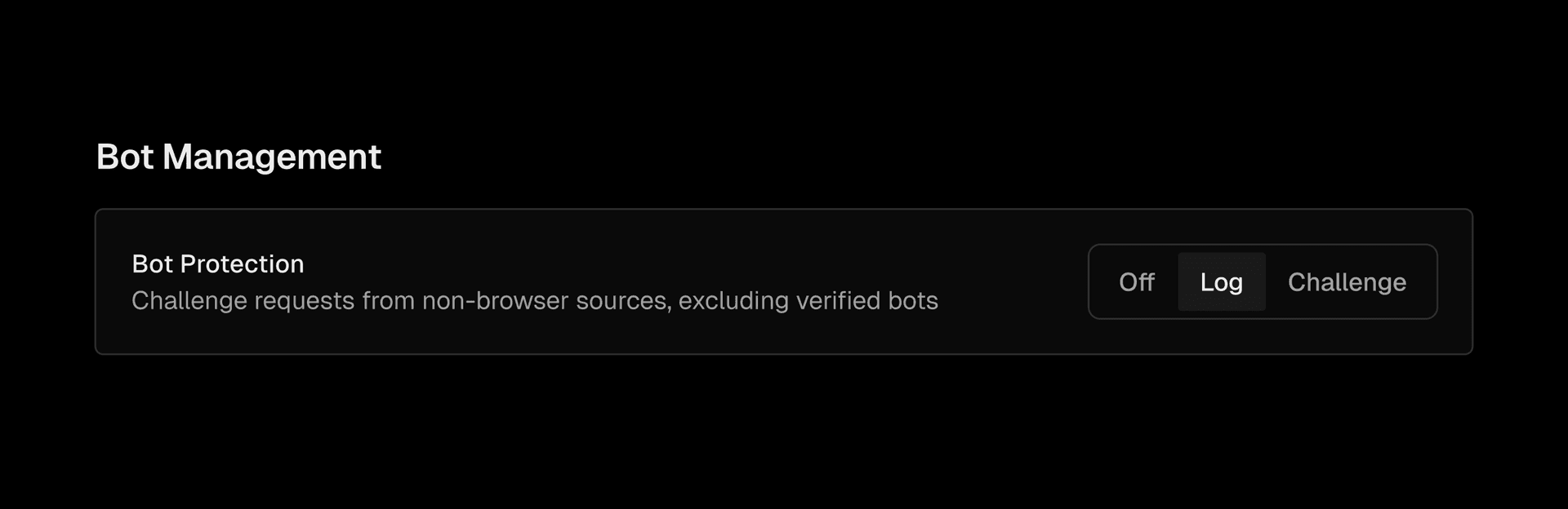 Bot Protection ties directly into the WAF. As a managed ruleset, we maintain the list of verified bots to ensure authenticity and reduce maintenance overhead.