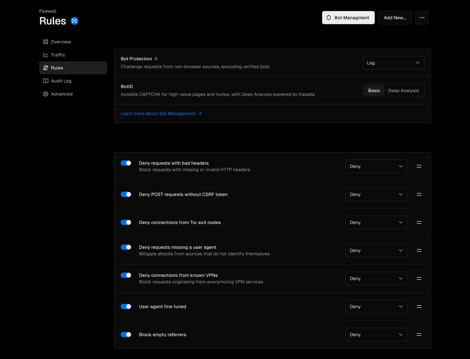 Firewall Rules now have a dedicated tab on the sidebar. You can see and manage all of your WAF custom rules in this view, including Bot Protection, Managed Rulesets, IP Blocking, and more. We’ve also moved the Audit Log to a dedicated tab for full visibility into Firewall changes.