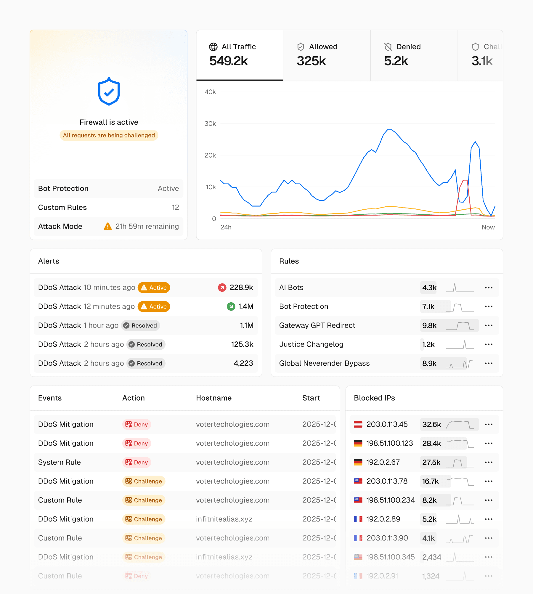 The Overview page is your high-level control center for the Firewall. It gives you a clear, birds-eye view of your site’s security posture. The traffic chart remains at the top, and we now surface the most important information based on recent activity.