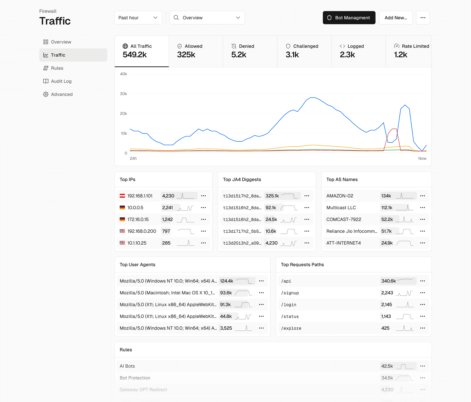 New sidebar navigation offers one click to Overview, Traffic, Rules, and Audit Log
