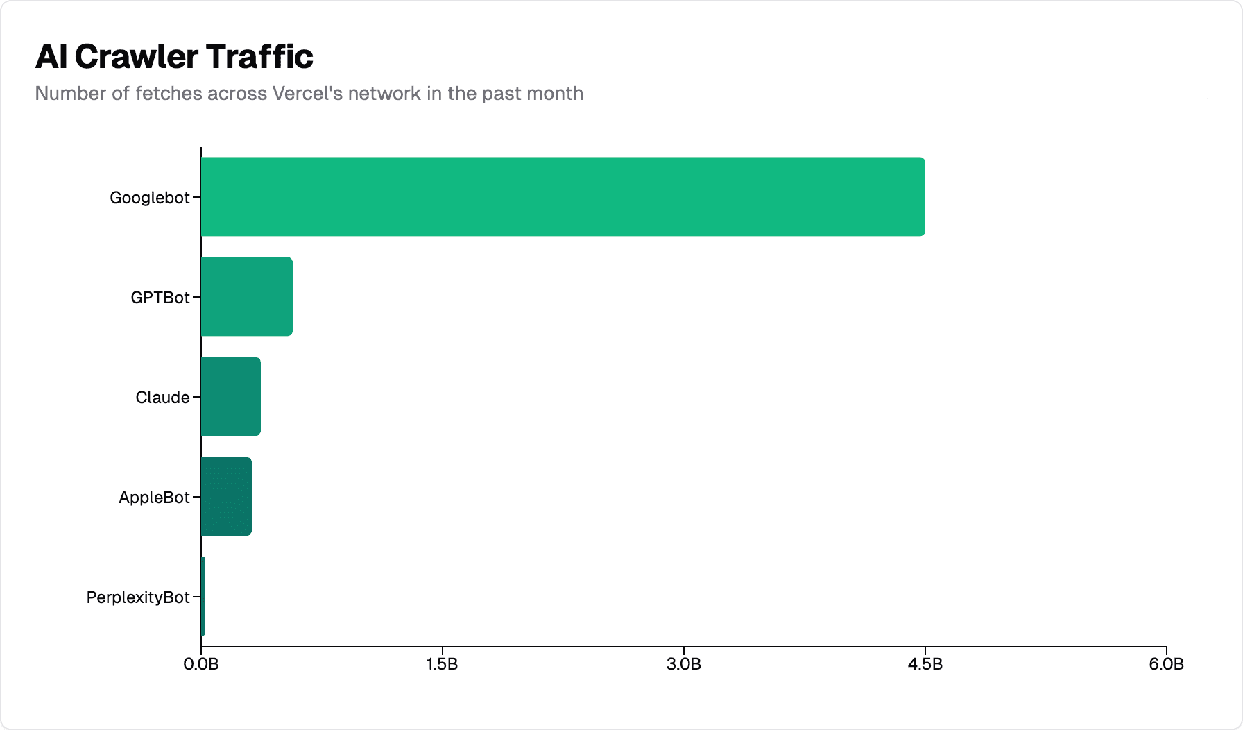 The volume of AI crawler traffic across Vercel's network is substantial. In the past month: