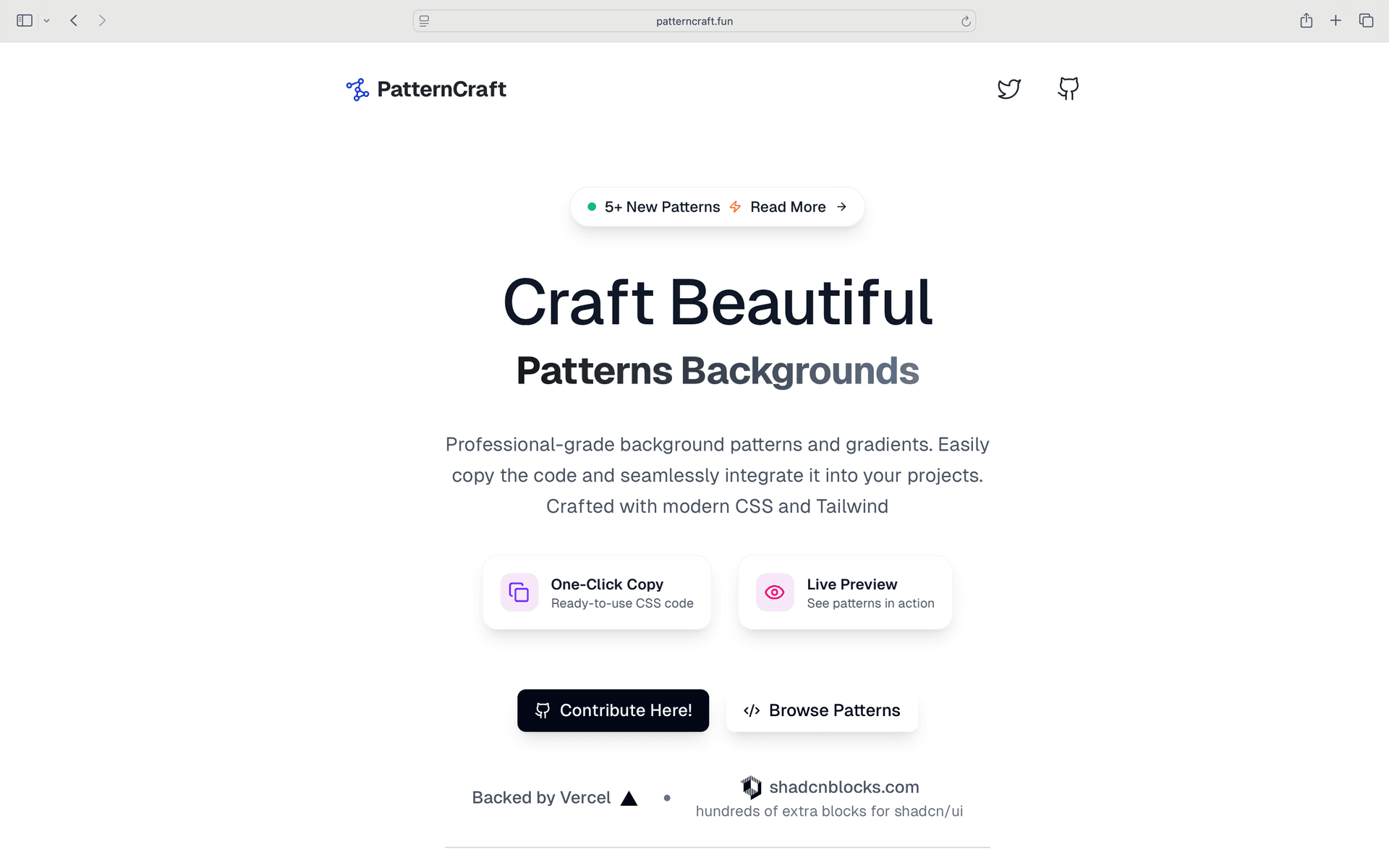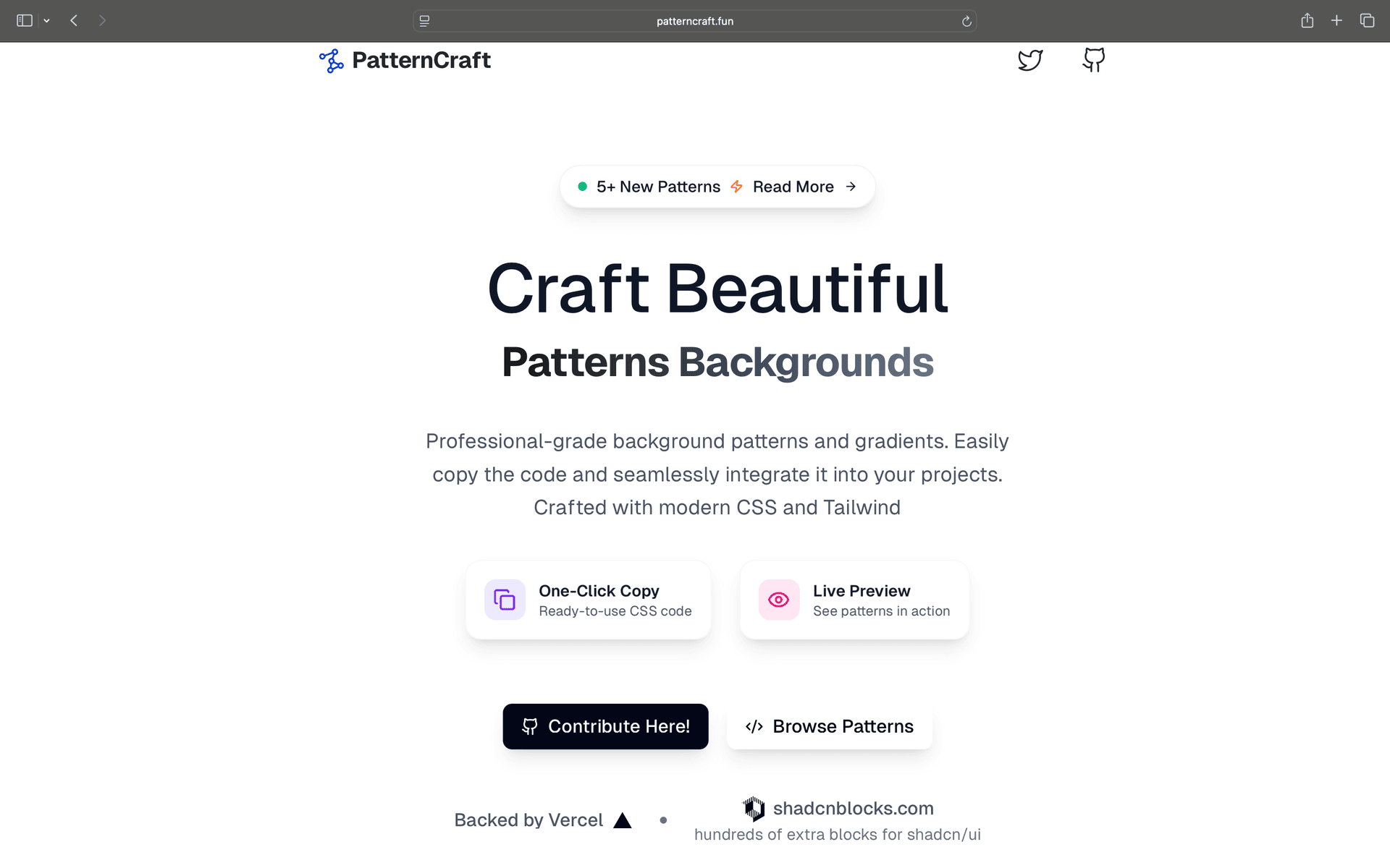 PatternCraft is an open-source library of pure-CSS and Tailwind background patterns that has grown into a popular inspiration hub for frontend developers. The project has 2.4K+ GitHub stars, 100K+ unique visitors, and 800–1K daily users exploring and sharing its lightweight, copy-paste patterns.