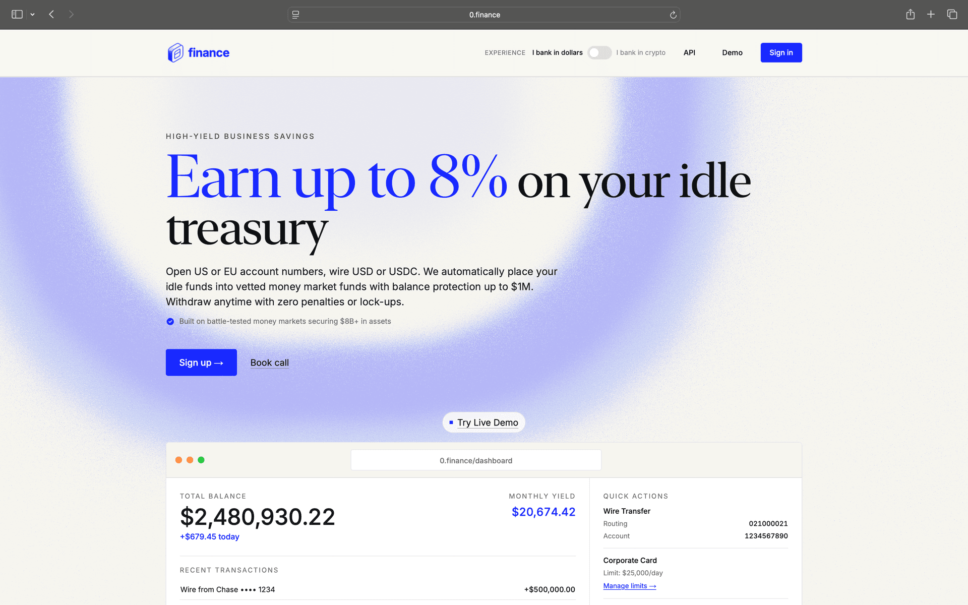0 Finance is building the first fully open source, forkable business savings account; letting companies send and receive money like a traditional bank while earning higher on-chain yield. The project ships updates daily and has already attracted strong early interest, including $2M in LOIs from startups.