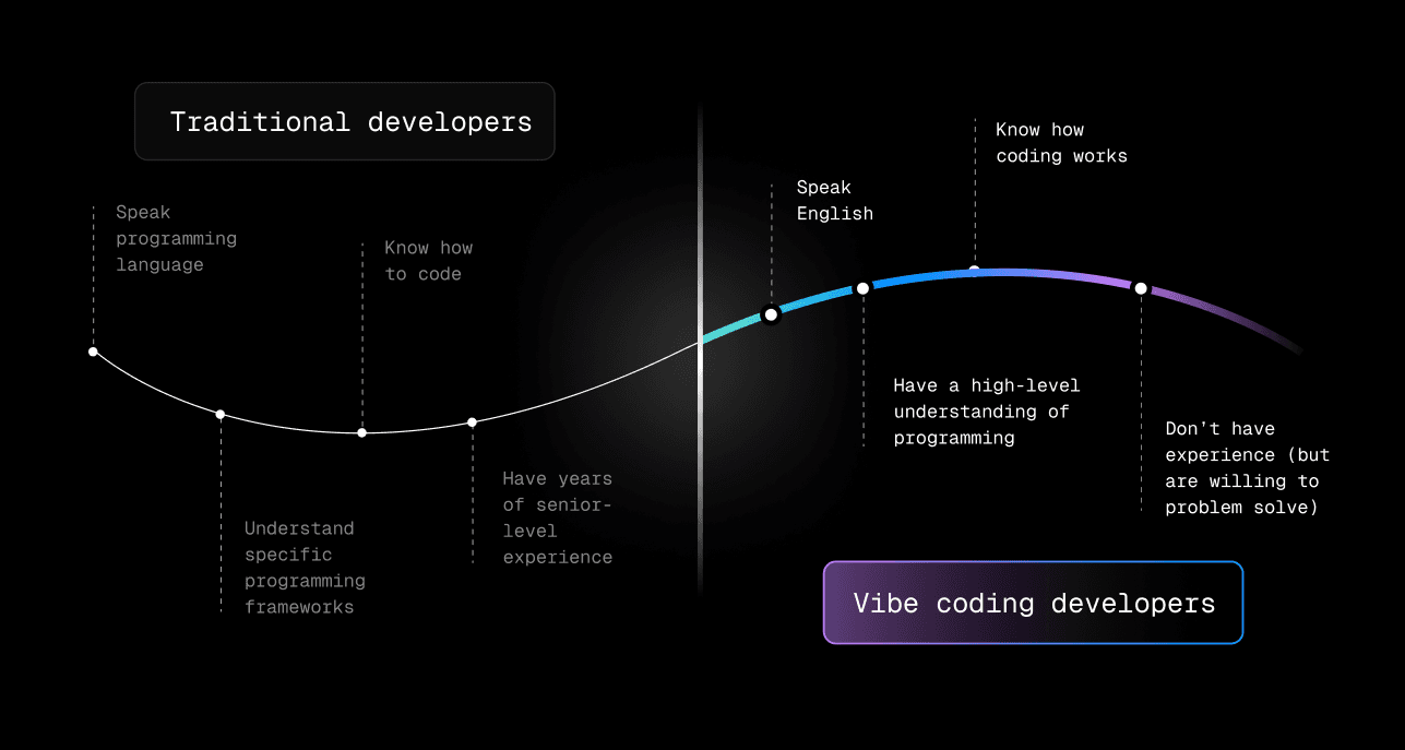 Vibe coding has redefined who can code, and what they’re able to create, reshaping what being a developer truly means. Traditional developers rely on programming languages, a deep understanding of code, and years of experience. Vibe coders only need English, a basic understanding of how technology works, and an idea.