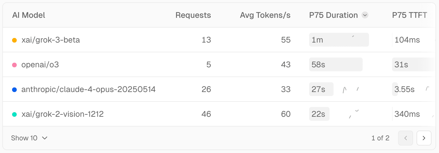 The Requests by Model chart shows the number of requests made to each model over time. This can help you identify which models are being used most frequently and whether there are any spikes in usage.