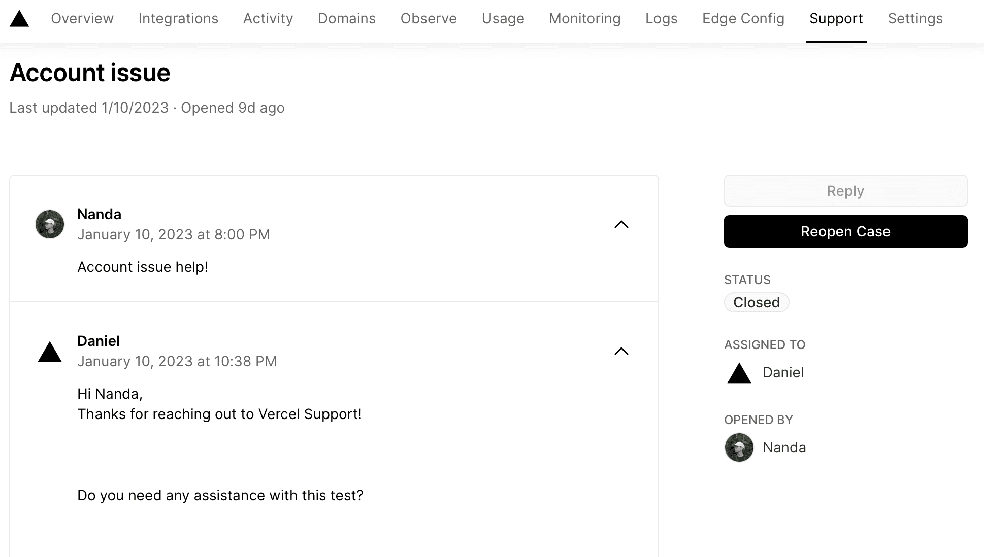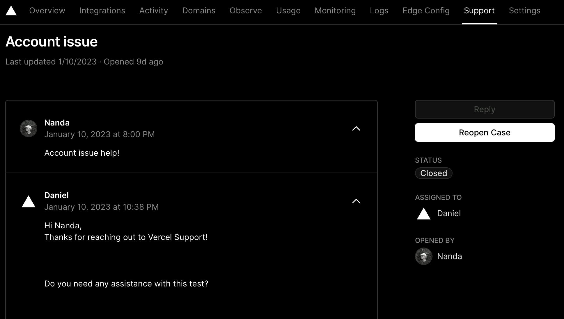 Each ticket displays all correspondences with the support team. Correspondence on your case is handled both over email and within the case module in the Vercel dashboard. You'll receive notifications about Vercel support responses through email, not within the Vercel dashboard.