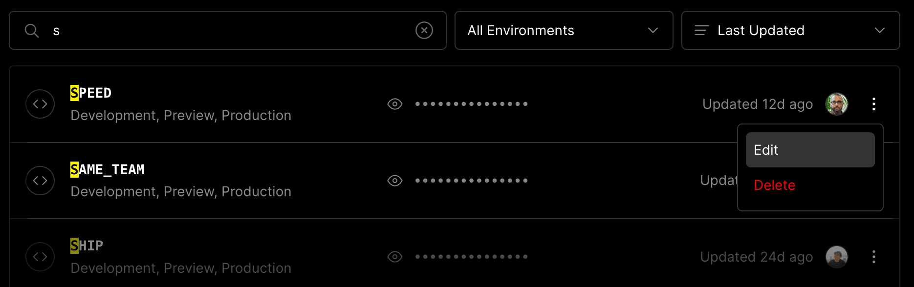- Use the context menu on the specific Shared Environment Variable by clicking the vertical ellipsis icon on the right side of the row