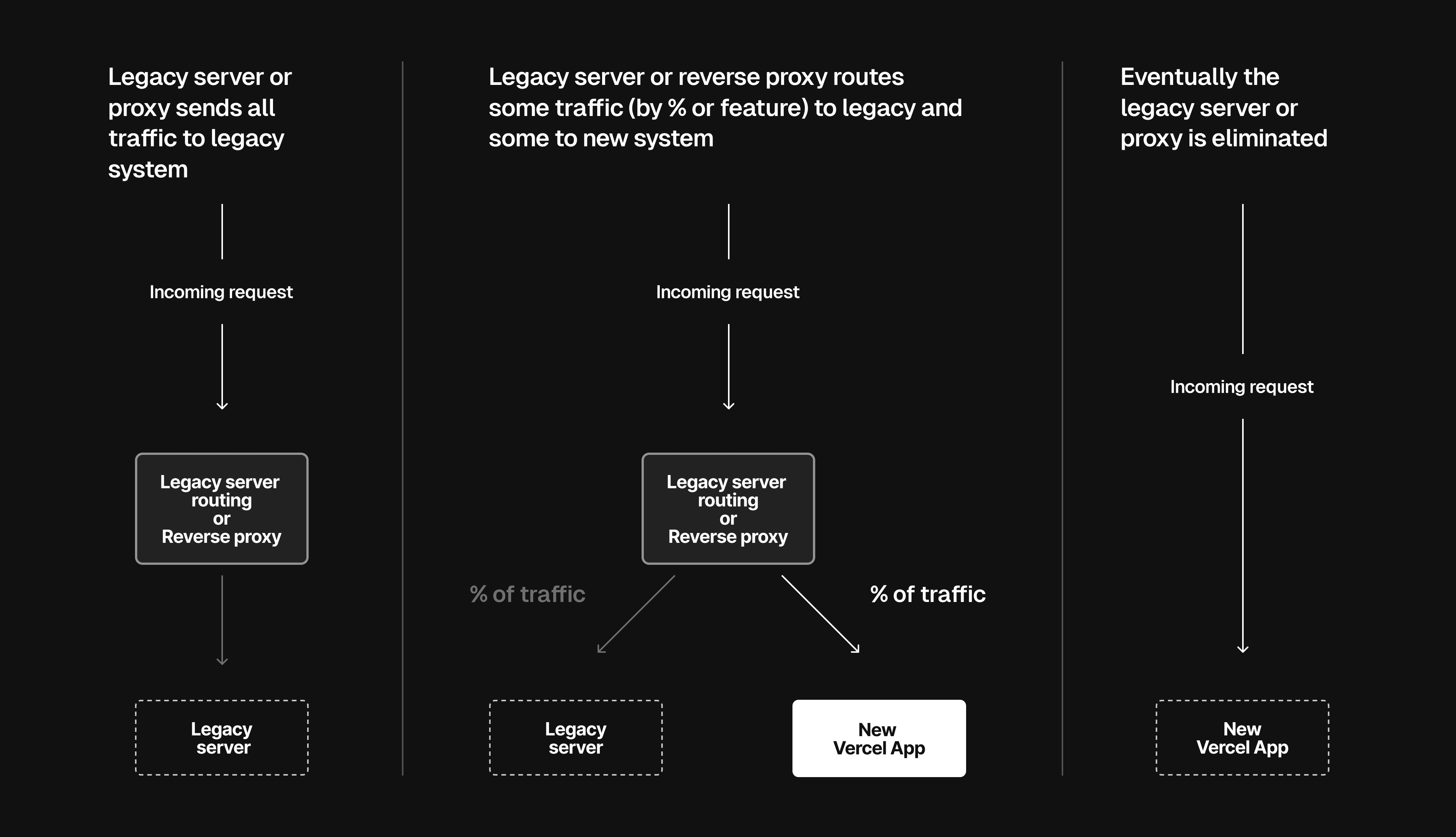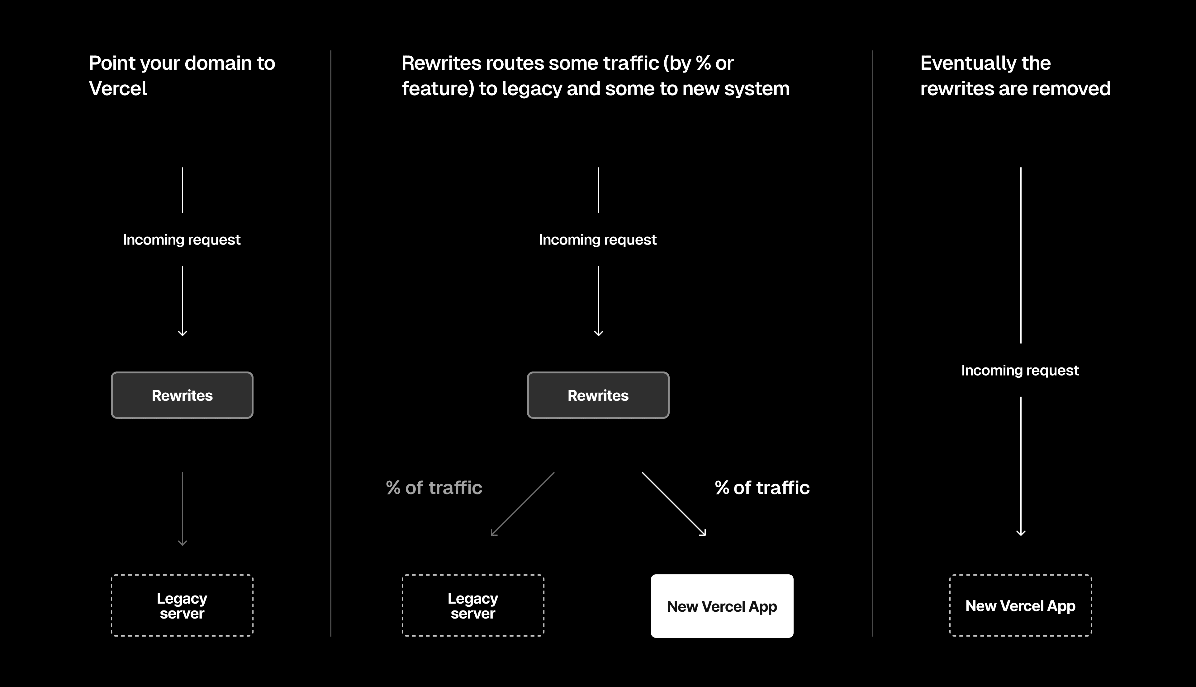 In this approach, you make Vercel the entry point for all your production traffic. When you begin, all traffic will be sent to the legacy server with rewrites and/or fallbacks. As you migrate different aspects of your site to Vercel, you can remove the rewrites/fallbacks to the migrated paths so that they are now served by Vercel.