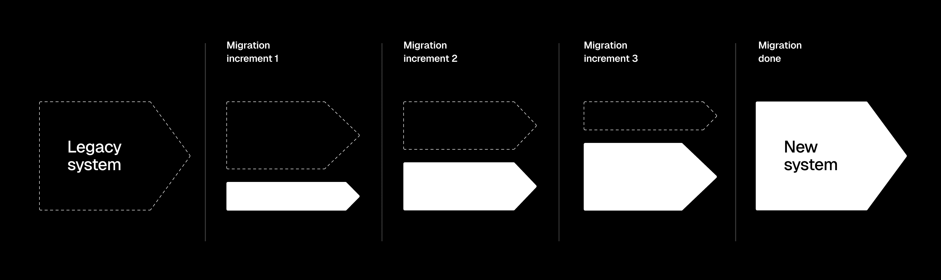 With incremental migration, legacy and new systems operate simultaneously. Depending on your strategy, you'll select a system aspect, like a feature or user group, to migrate incrementally.