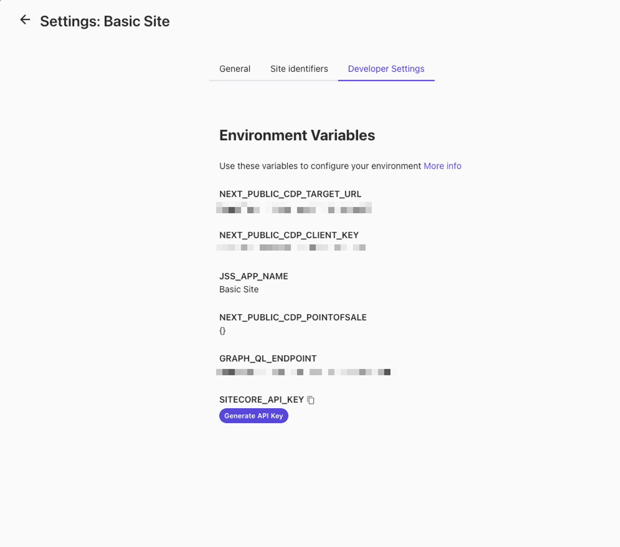 - Setting up environment variables in Vercel for Sitecore API key, GraphQL endpoint, and JSS app name