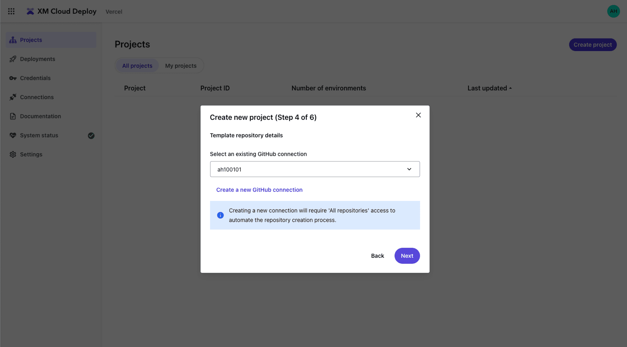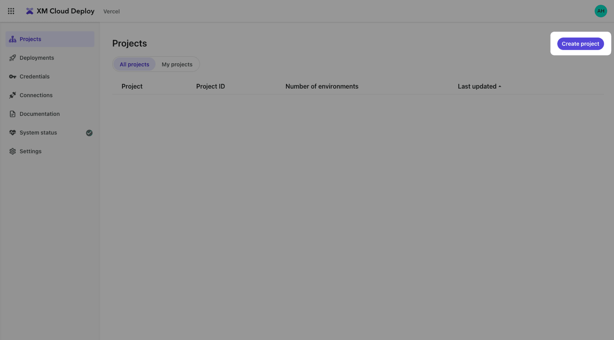 Navigate to the Projects page and select Create project.