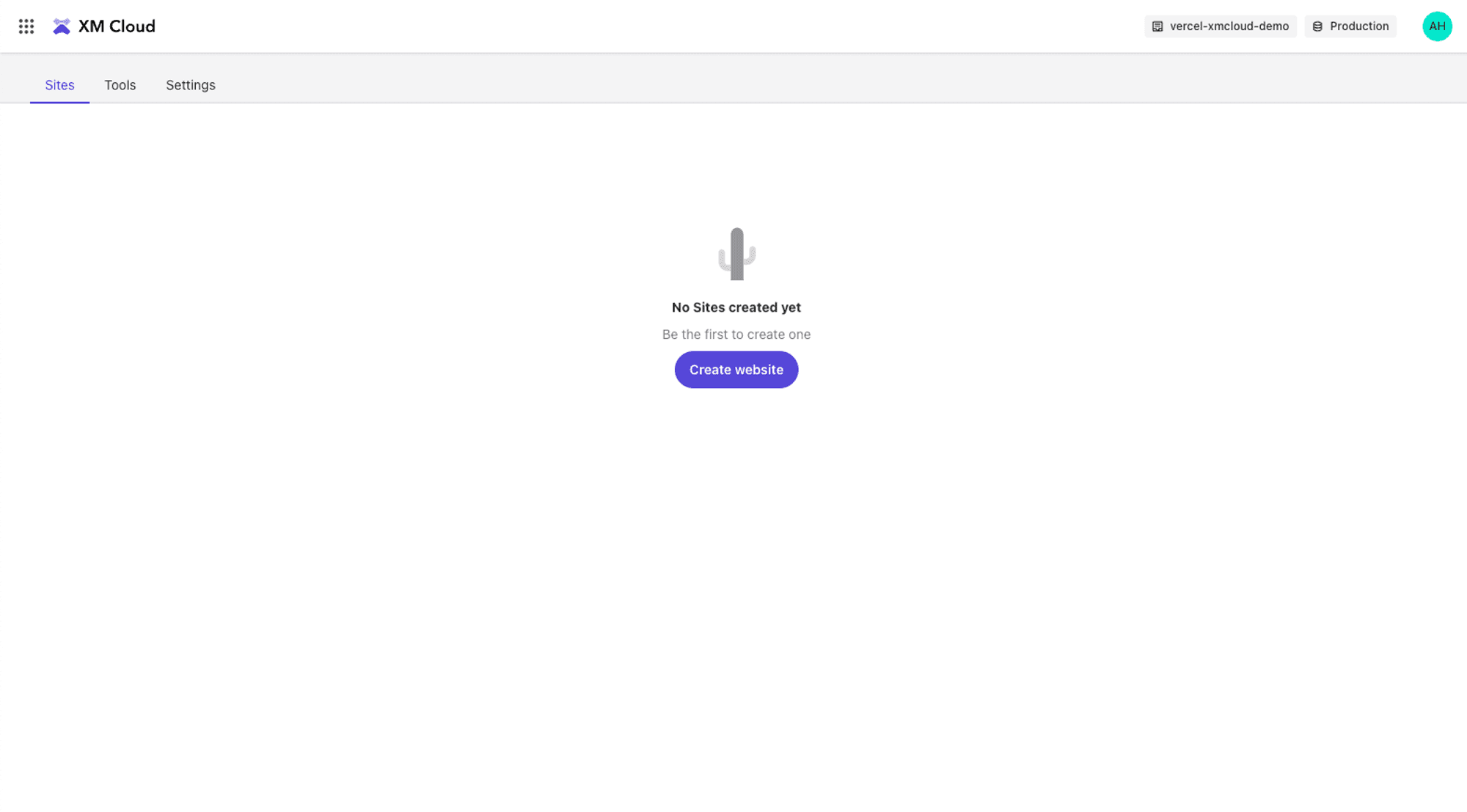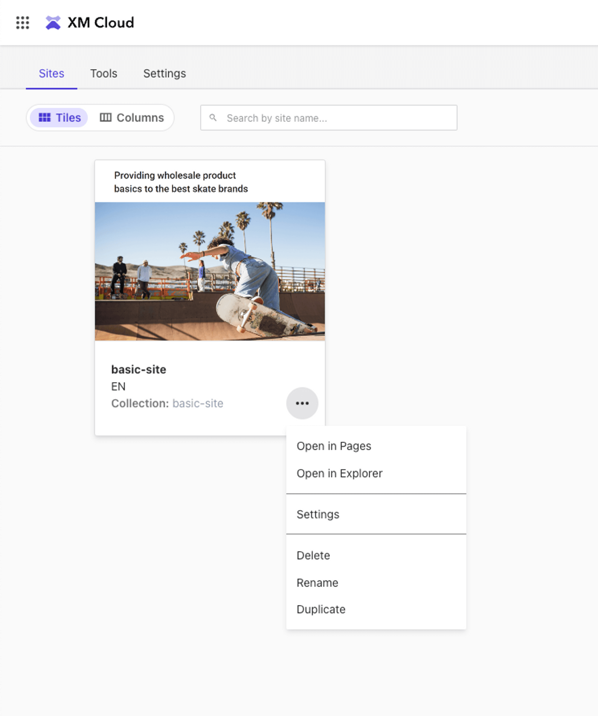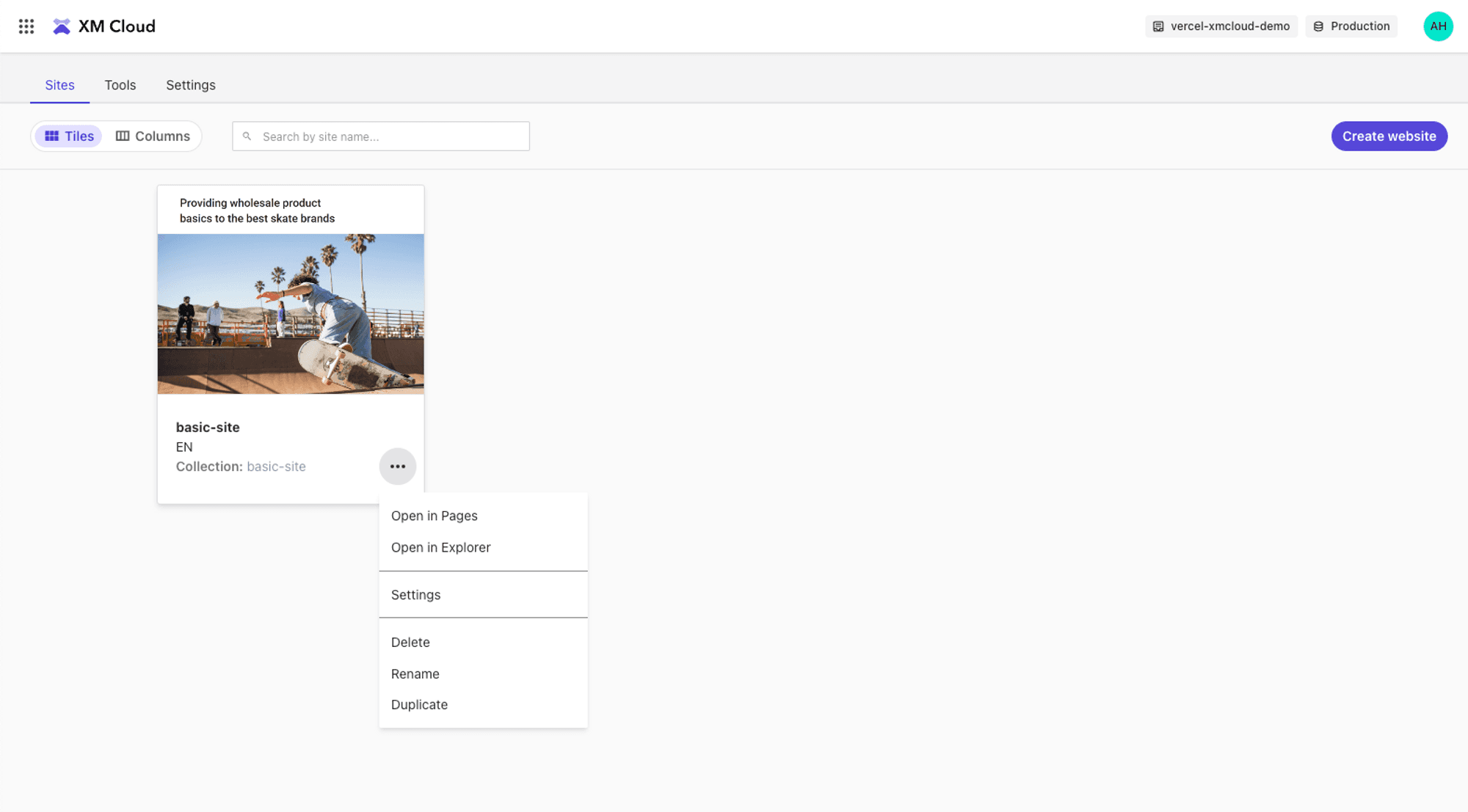 Next, navigate to your newly created XM Cloud site under Sites and select Settings.