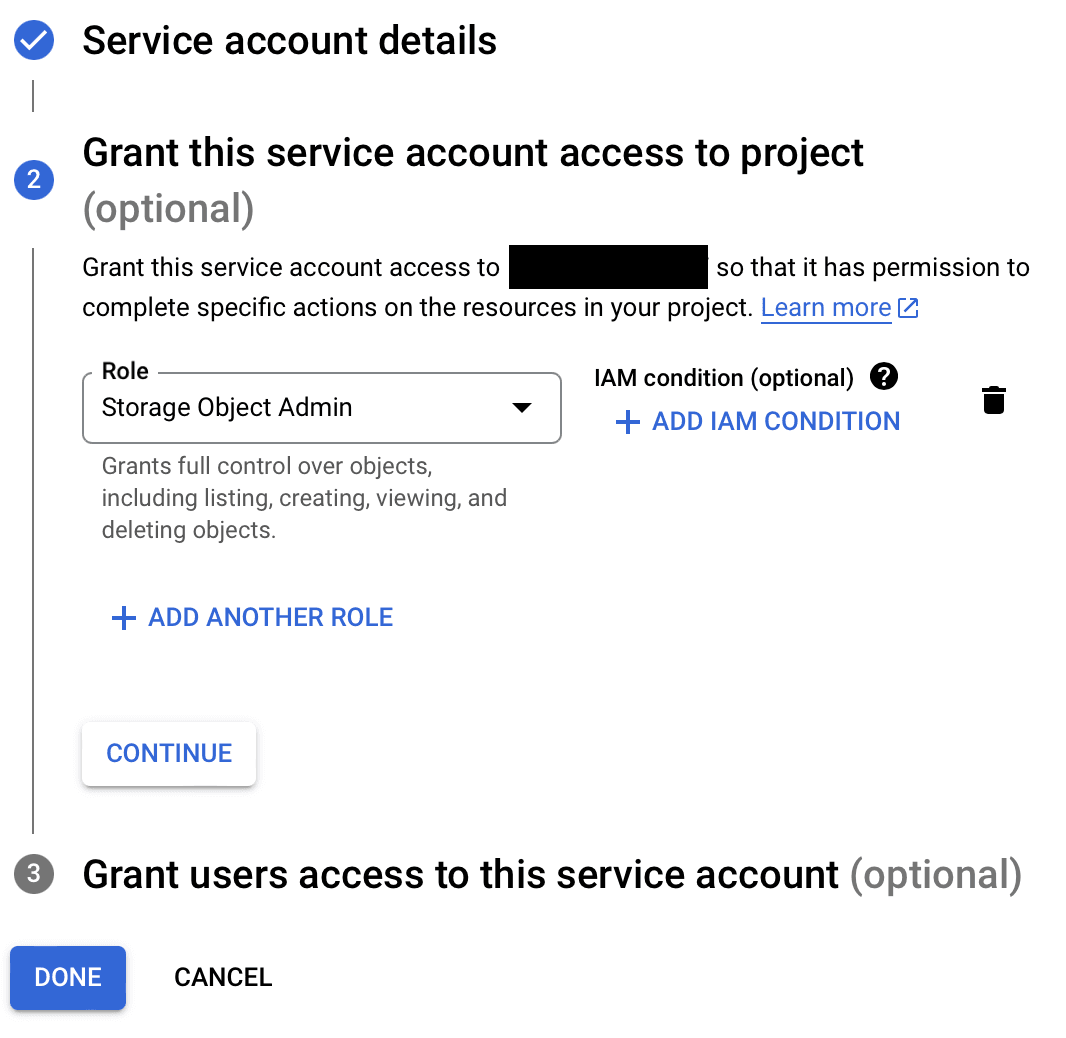 - Enter an ID for the service account, e.g. and click Create and continue.