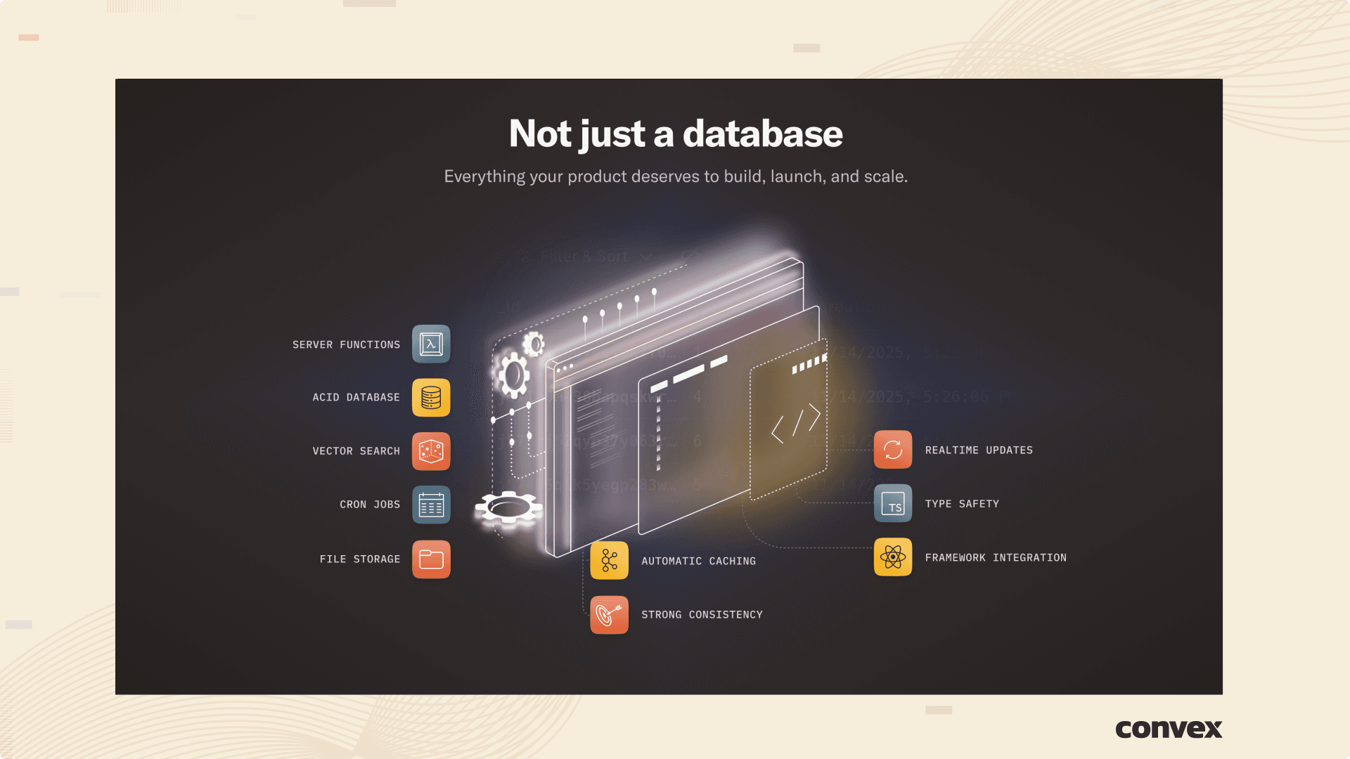 Convex Functions, Database, File Storage, Scheduling, and Search fit together cohesively. Everything in Convex is live and realtime.