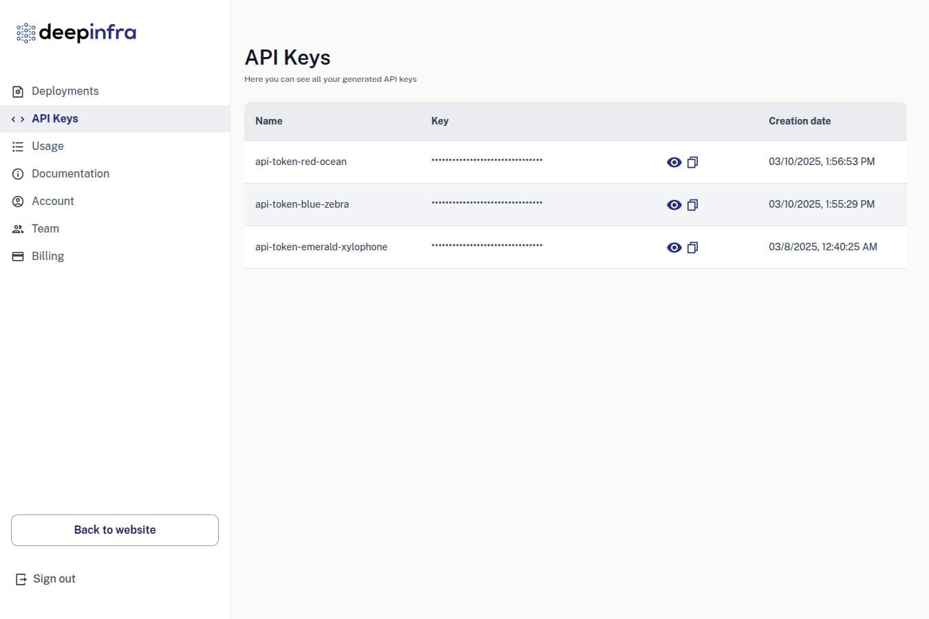 Each Deep Infra api token exports DEEPINFRA_API_KEY environment variable that you can connect to your Vercel projects.