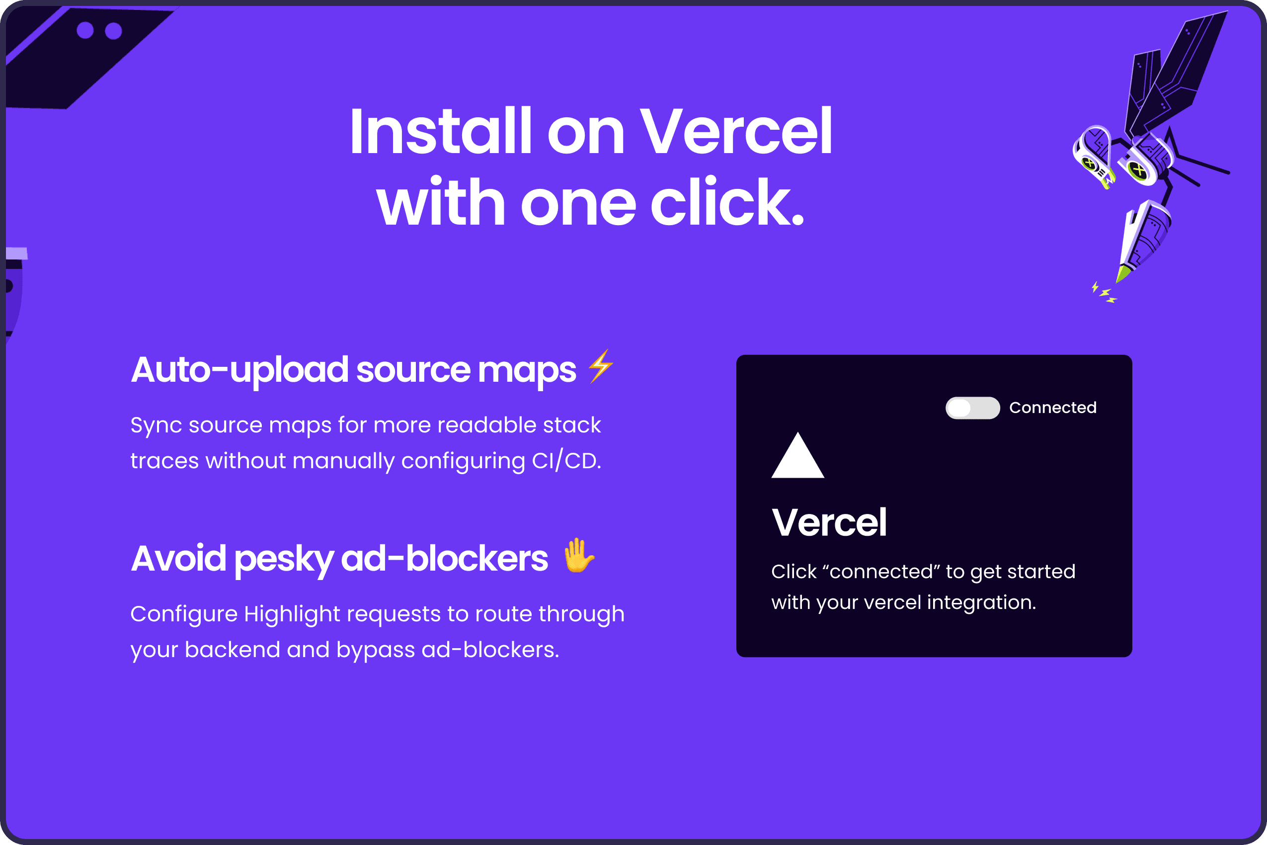 The Highlight Vercel integration is an easy way to connect your Vercel projects to new or existing projects in Highlight.