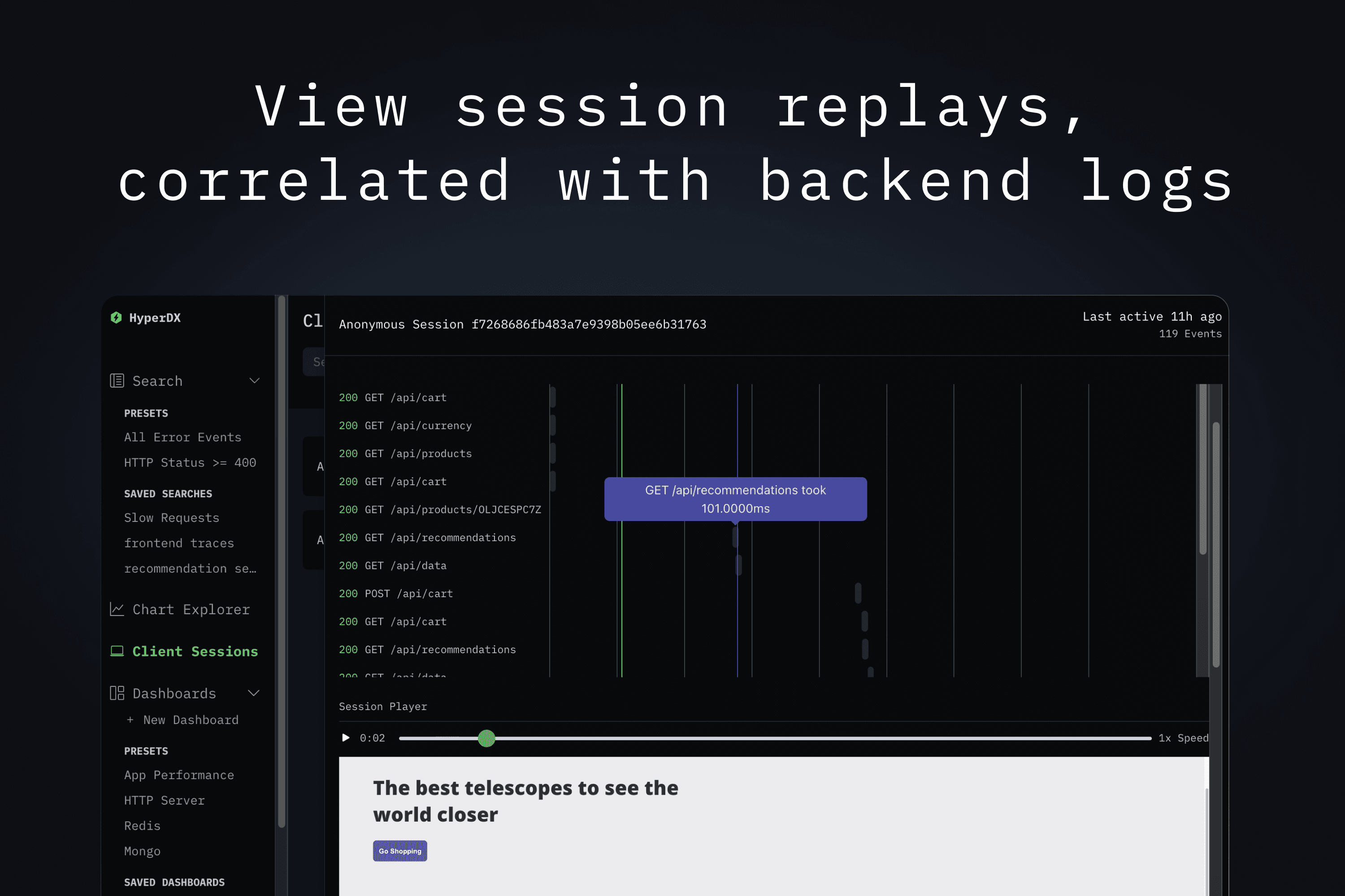 After all that, you can add application performance instrumentation and session replay to correlate all your logs and traces from frontend to backend in one place, powered by OpenTelemetry.