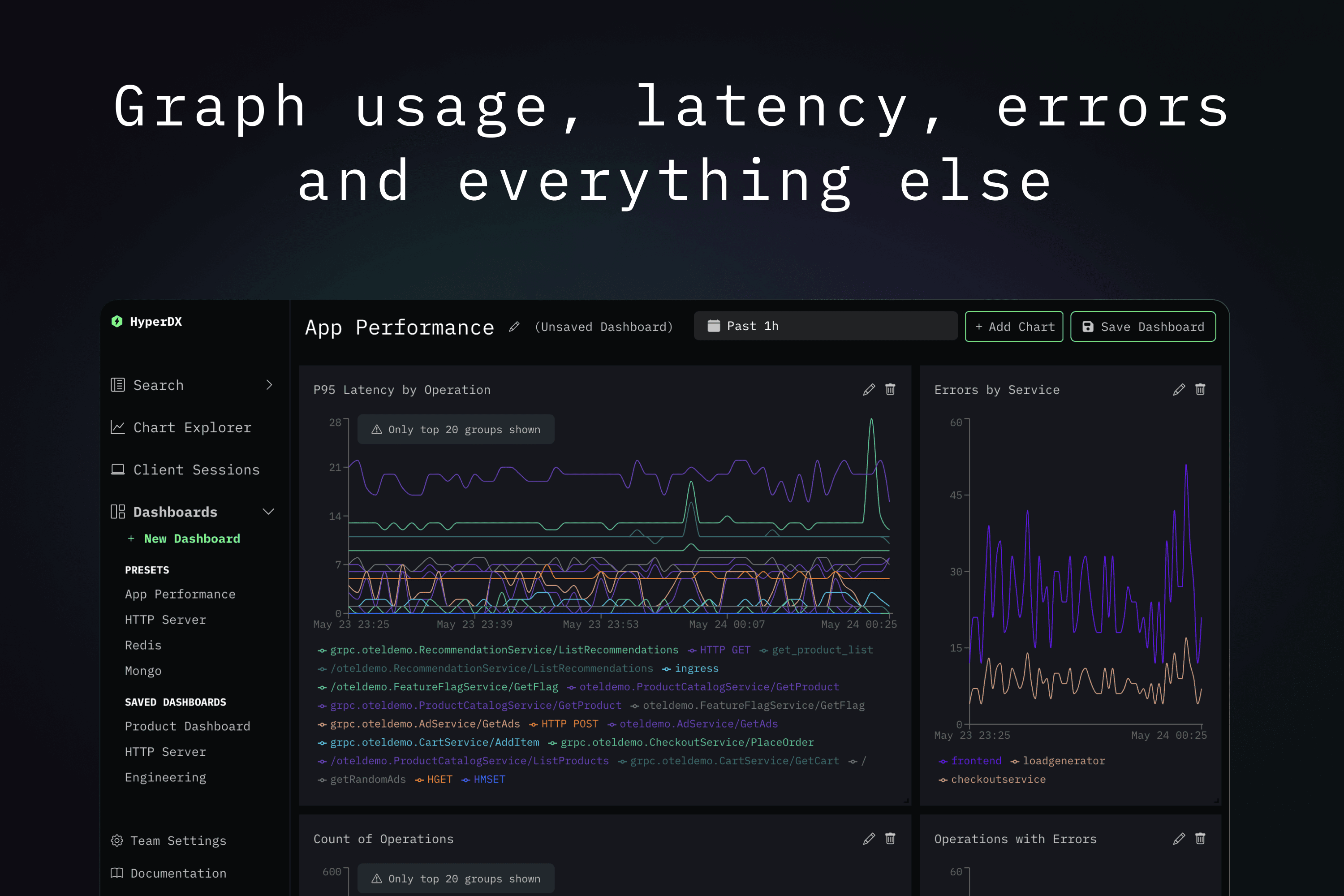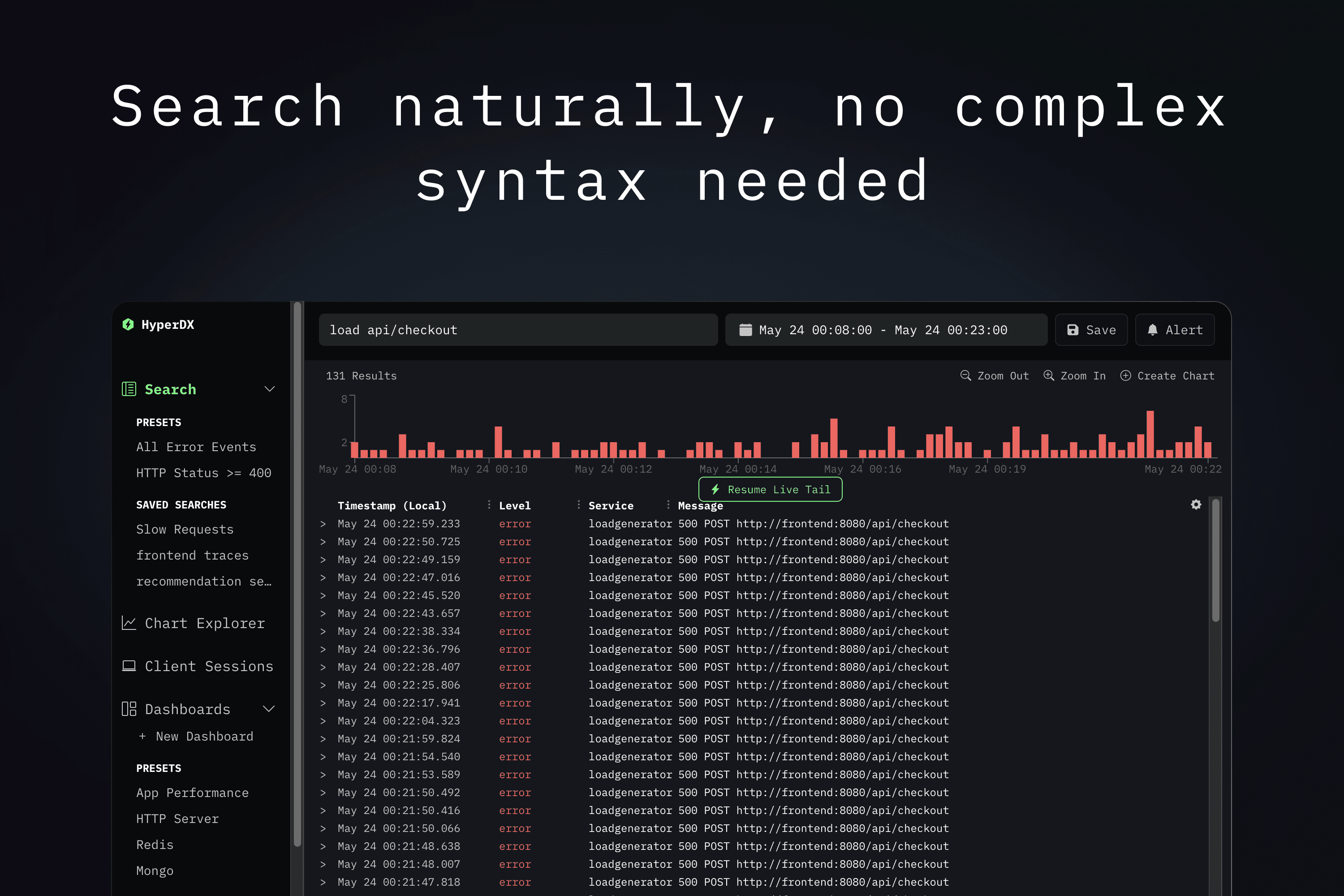 With HyperDX, you can search across all your application logs with simple keyword search, no complex syntax needed. In one click, you can create alerts that send to Email, Slack or Pagerduty to get alerted when things go wrong (or when a new user signs up!).