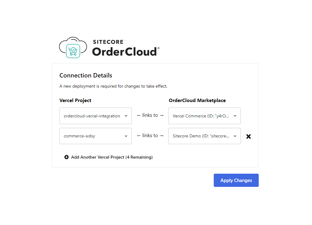 Follow the prompts to add the OrderCloud integration to your Vercel project. It will create 2 API Client resources in your selected OrderCloud marketplace with AppNames of "Vercel-Storefront-Connector" and "Vercel-Middleware-Connector". Note: if a API Clients with these AppNames already exist, new ones will not be created. The details of those clients will saved in the following project environment variables.
