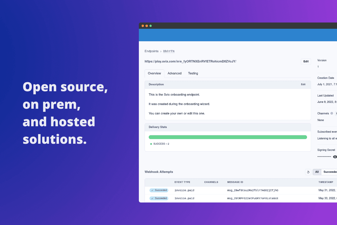 Svix provides a secure, reliable, and scalable webhook service that you can integrate with your application in minutes.
